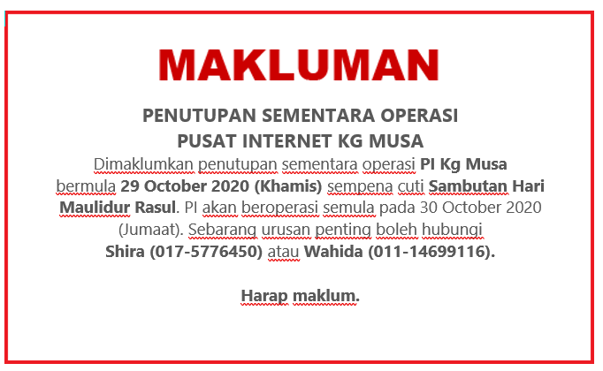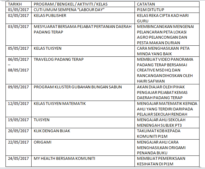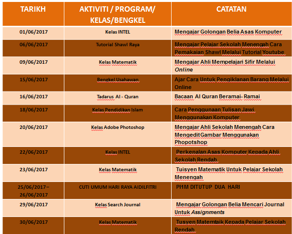 TARIKH PROGRAM / BENGKEL / KELAS CATATAN 06/09/2017 PROGRAM E-REZEKI Kerjasama dengan M-DEC 11/09/2017 MESYUARAT KLUSTER DAN KURSUS KERJA SATU IBADAH Mesyuarat Berkaitan Penubuhan Koperasi Pi1m 13/09/2019 – 14/09/2019 ADVOKASI KLIK DENGAN BIJAK Bekerjasama Dengan Mcmc Wilayah Utara Untuk […]