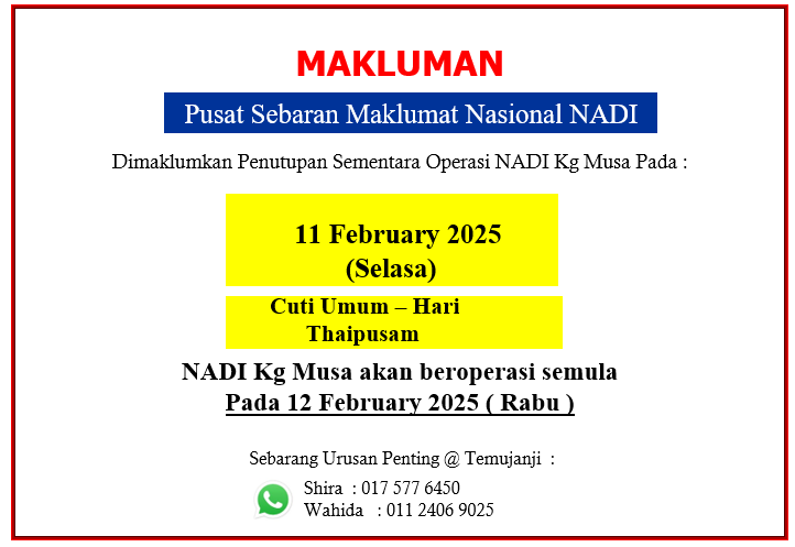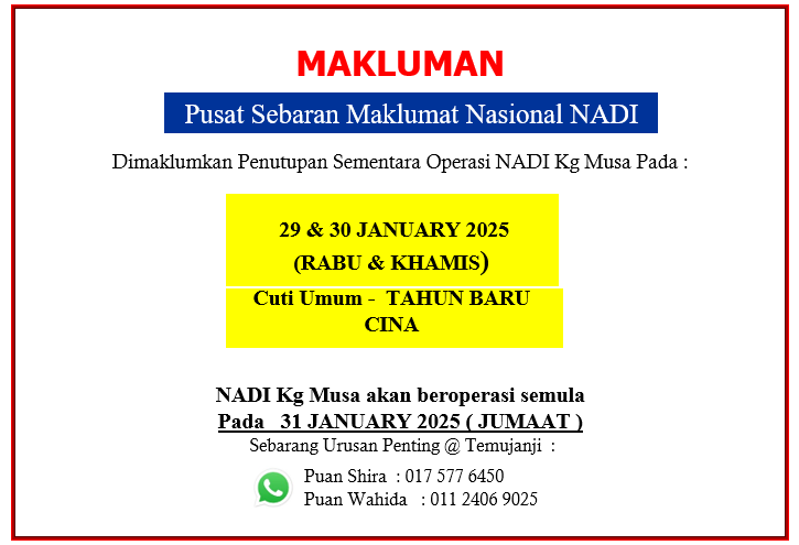 TARIKH AKTIVITI / PROGRAM / BENGKEL / KELAS CATATAN 02.03.2025 – Penutupan NADI Sempena Awal Ramadan NADI Kg Musa 03.03.2025 – Mahir Jahit NADI Kg Musa 06.03.2025 – Mahir Foto NADI Kg Musa 07.03.2025 – Mahir Masak – Mahir Pertanian […]