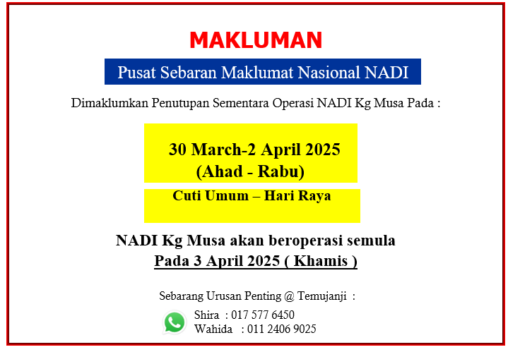 Tarikh :15 Januari 2025 (Rabu) Masa :8.00 Pagi – 12.00 Tengahari Lokasi : Sekolah Jenis Kebangsaan Cina Kou Hua Peserta : 160 Orang Peserta Tujuan Pembukaan kaunter dilakukan oleh petugas NADI Kluster Padang Terap di SJK(C) Kou Hua semasa Hari […]